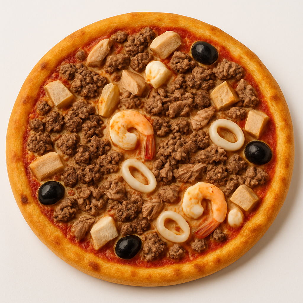 Sauce tomate, mozzarella, poulet, thon, viande hachée, fruit de mer, olive, origan